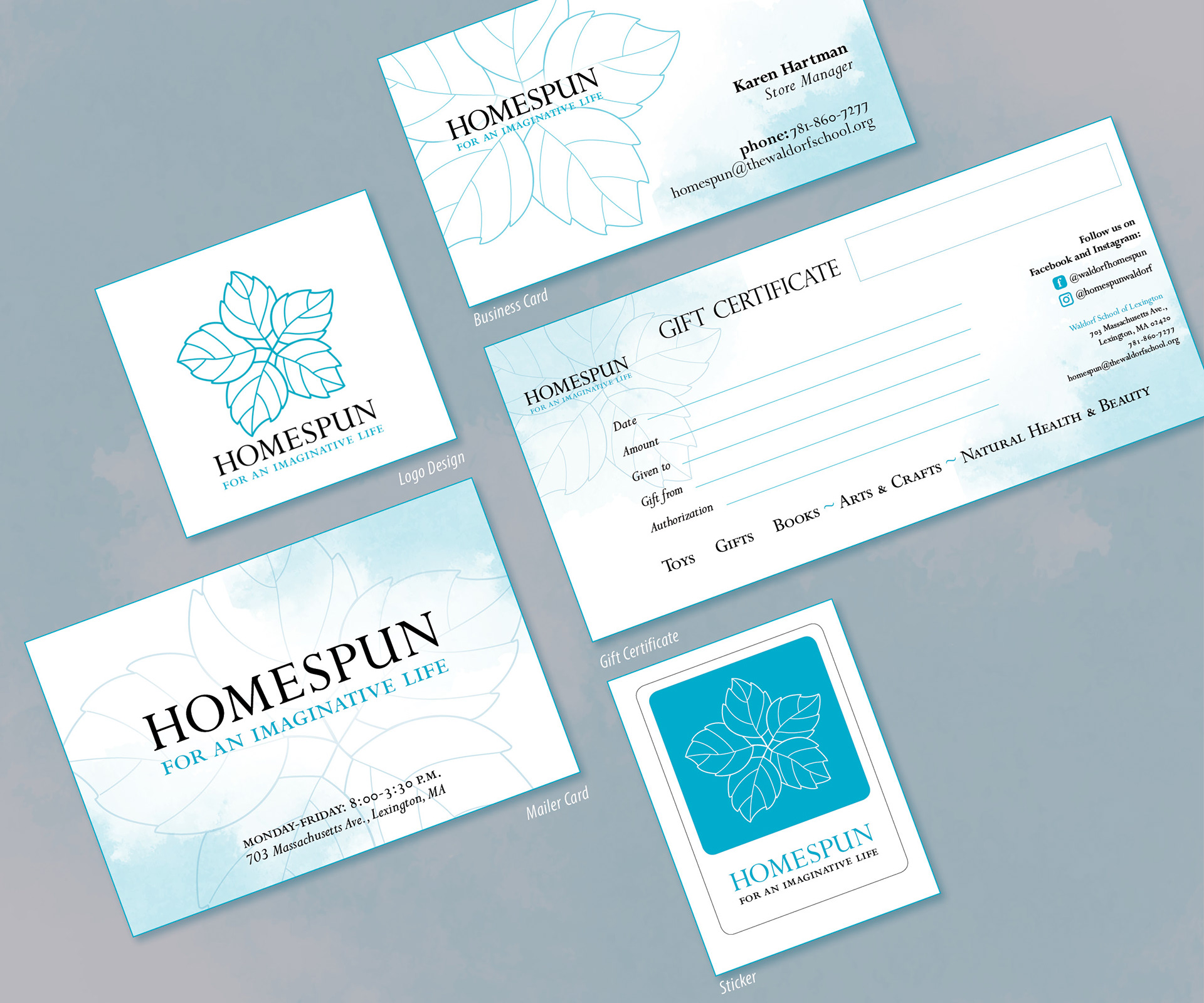 I designed a nature-inspired logo and expanded it across signage, stationery, gift bags, stickers, and gift certificates—building a visual language that felt both consistent and full of personality. To bring the brand into the physical space, I also hand-painted a large mural inside the store. The final identity helped HomeSpun stand out in a competitive market, while staying true to its mission of offering meaningful, high-quality goods for kids and adults alike.
